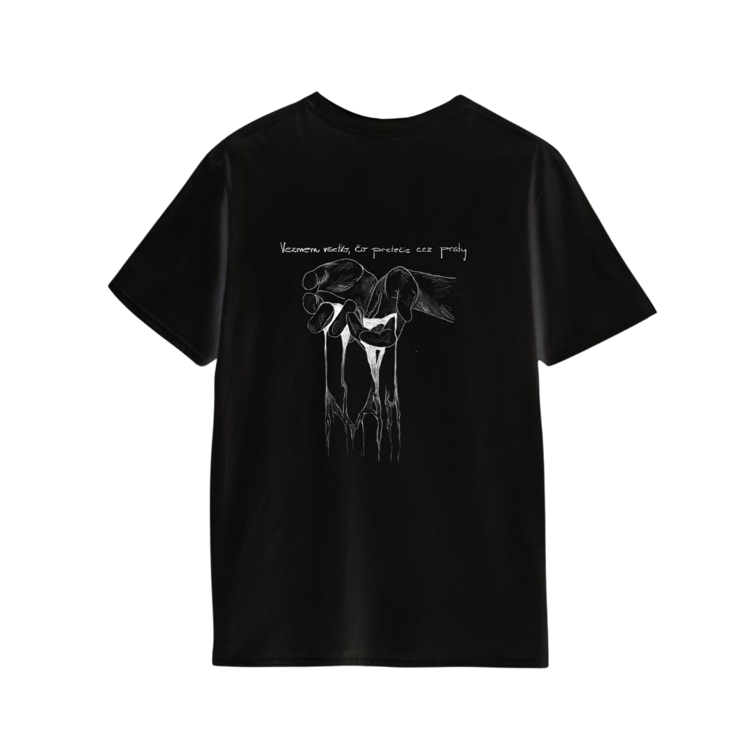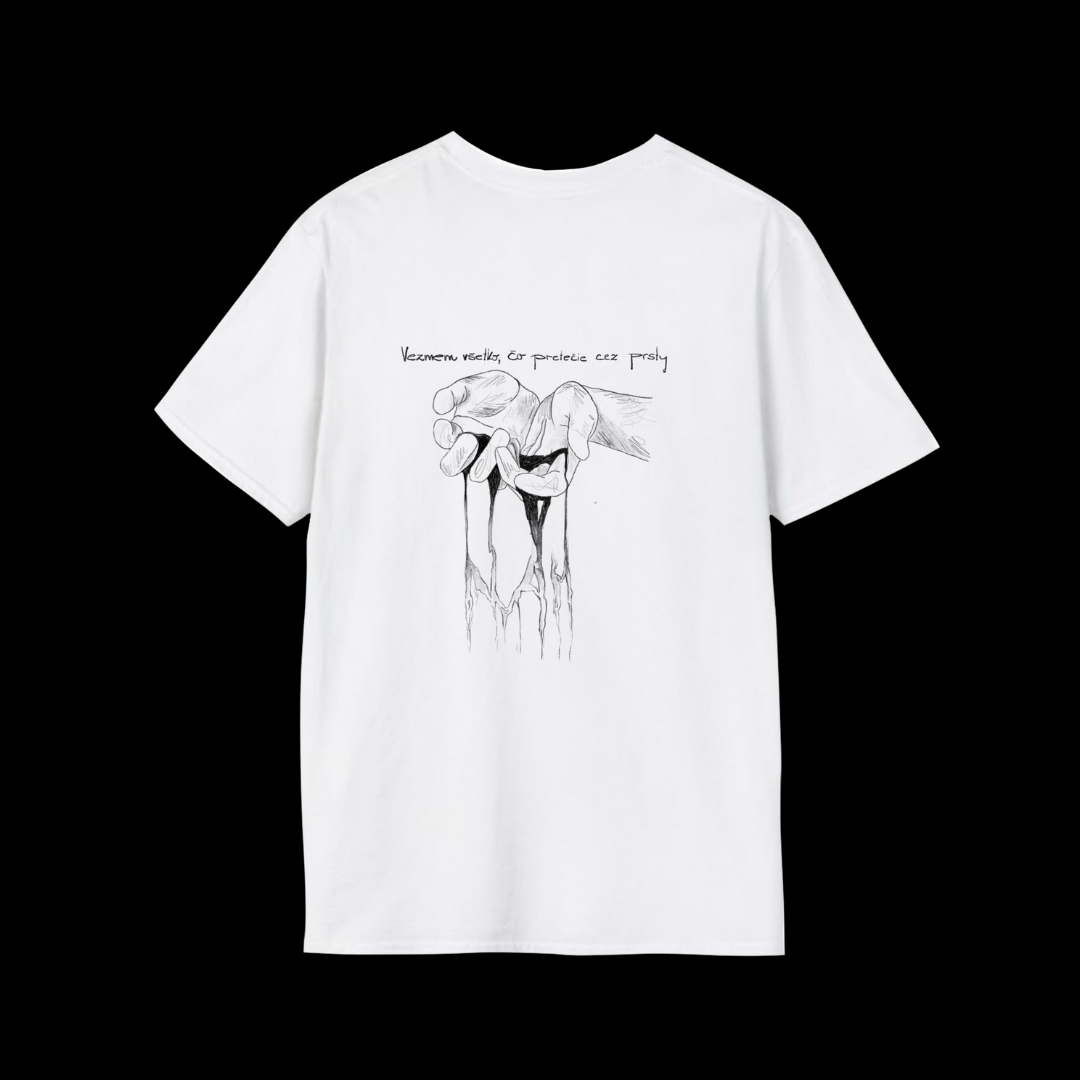 Krátke bavlnené tričko z kolekcie Taliia Designs s dizajnom inšpirovaným skladbou Cigo a káva. Na tričku je potlačený výrazný motív „Vezmem všetko, čo pretečie cez prsty“, navrhnutý našou grafičkou Natáliou.